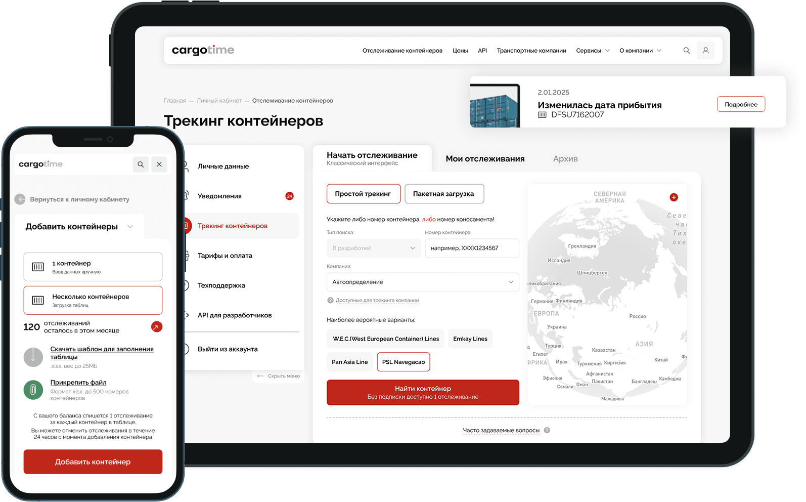 Мы автоматически обновляем информацию по контейнерам два раза в сутки, а обо всех важных изменениях предупредим в уведомлениях и по почте